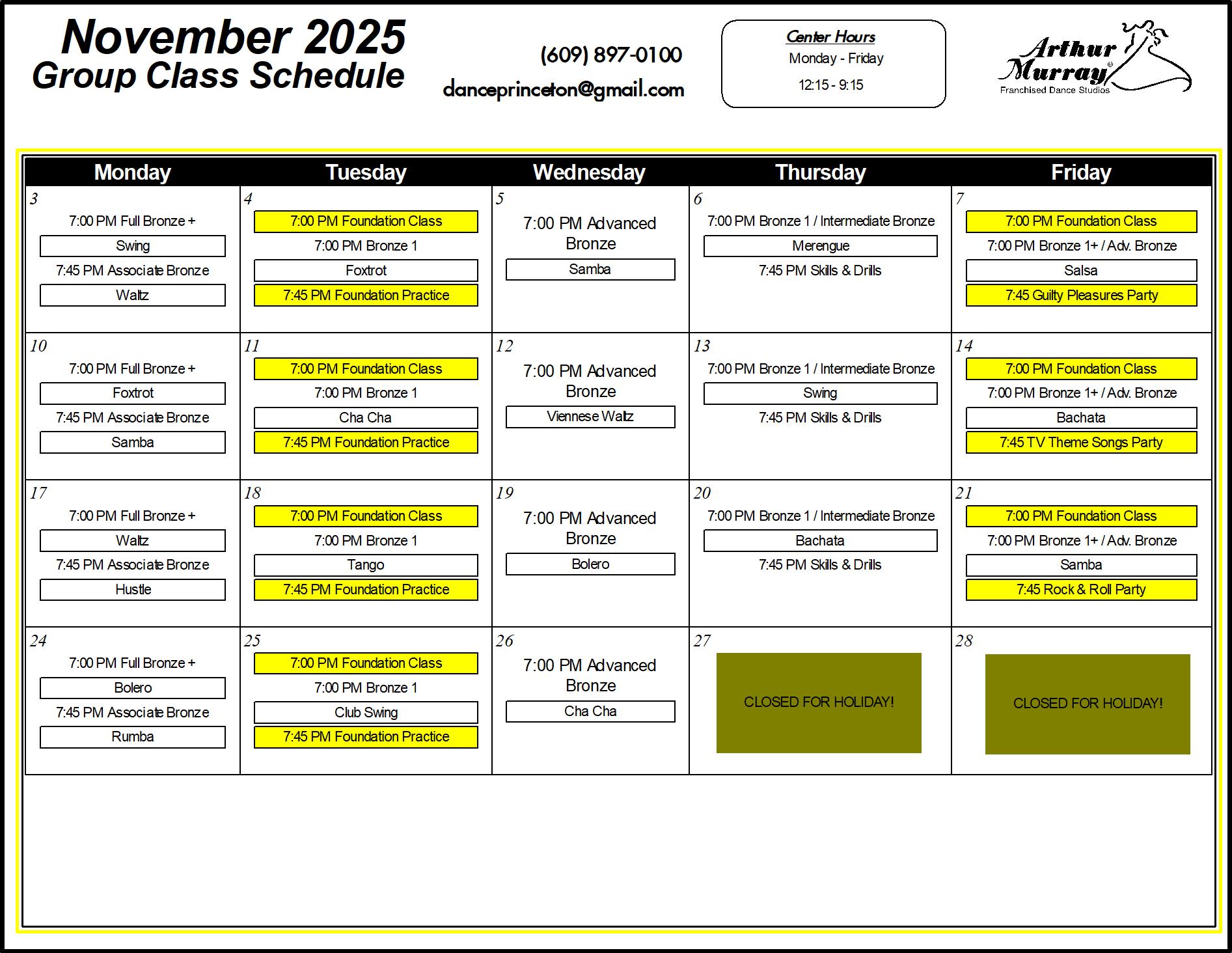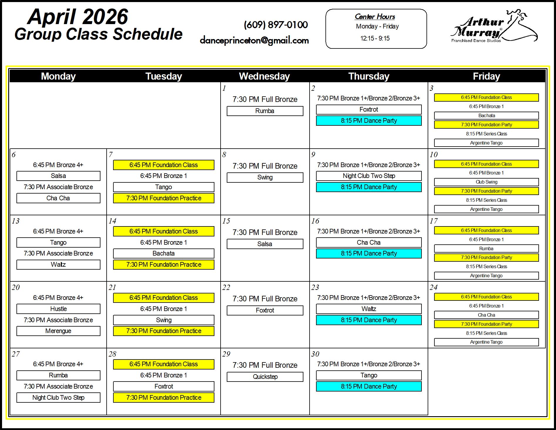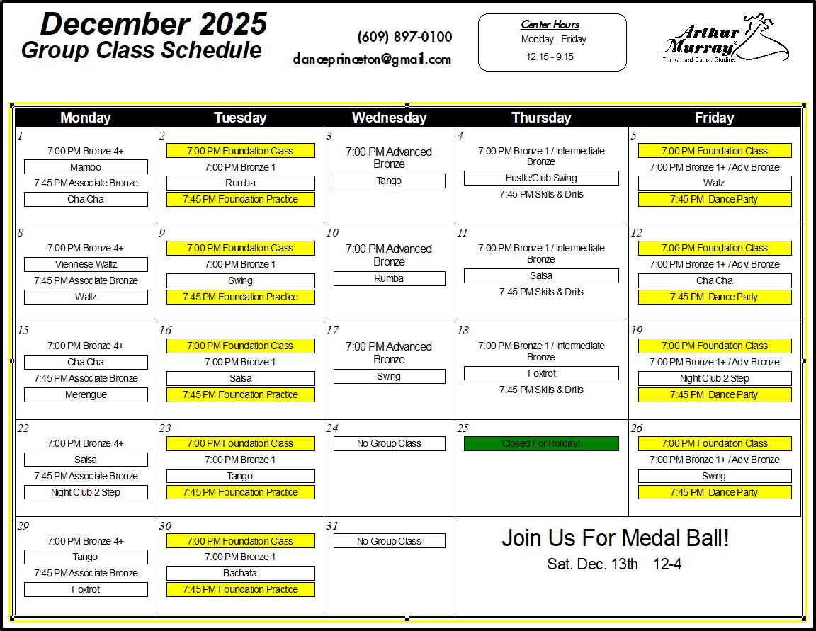 Explore the Arthur Murray Dance Studio class schedule in Princeton, NJ. If you’re interested in joining us, give us a call for more information on how you can get started with our Introductory Lesson!