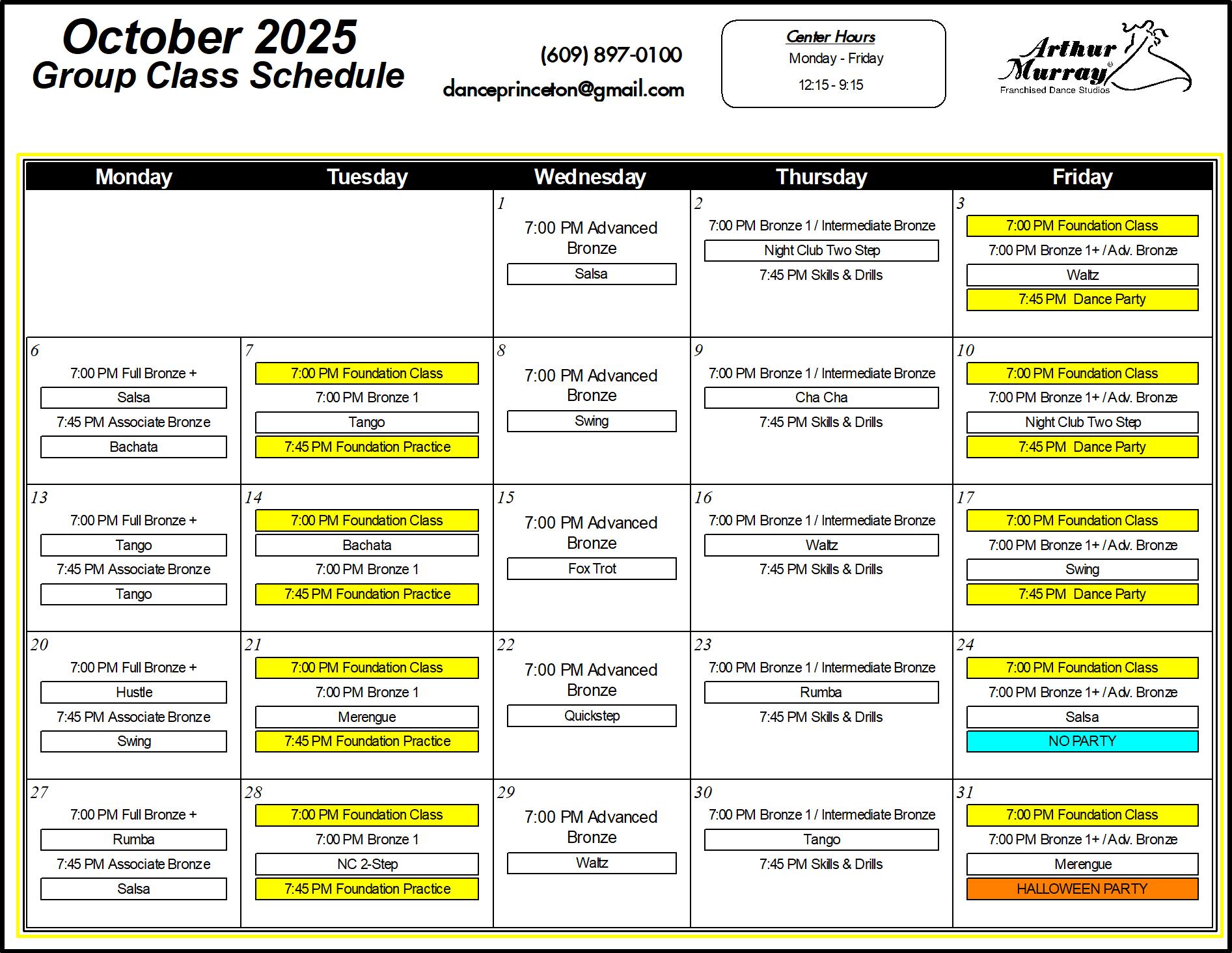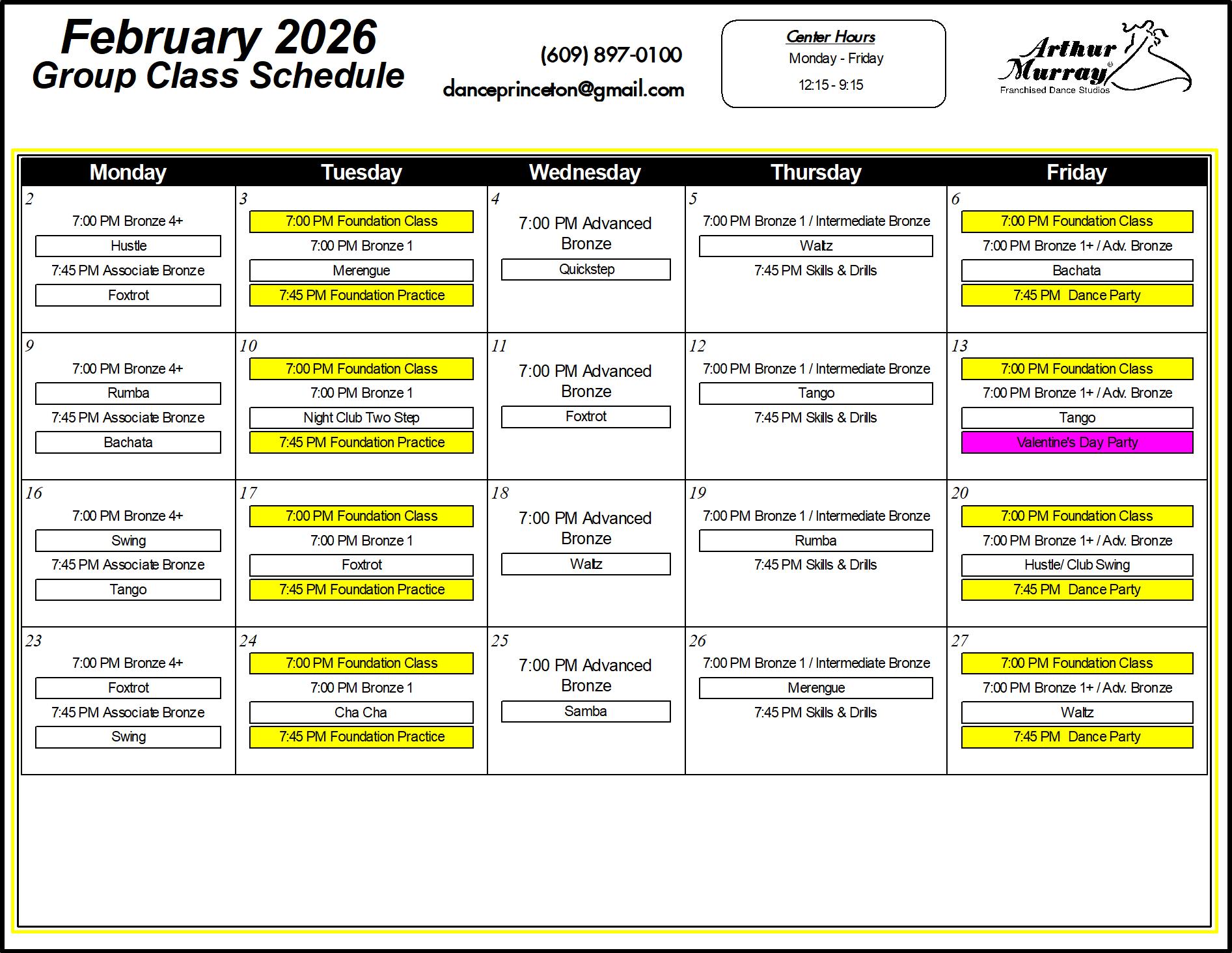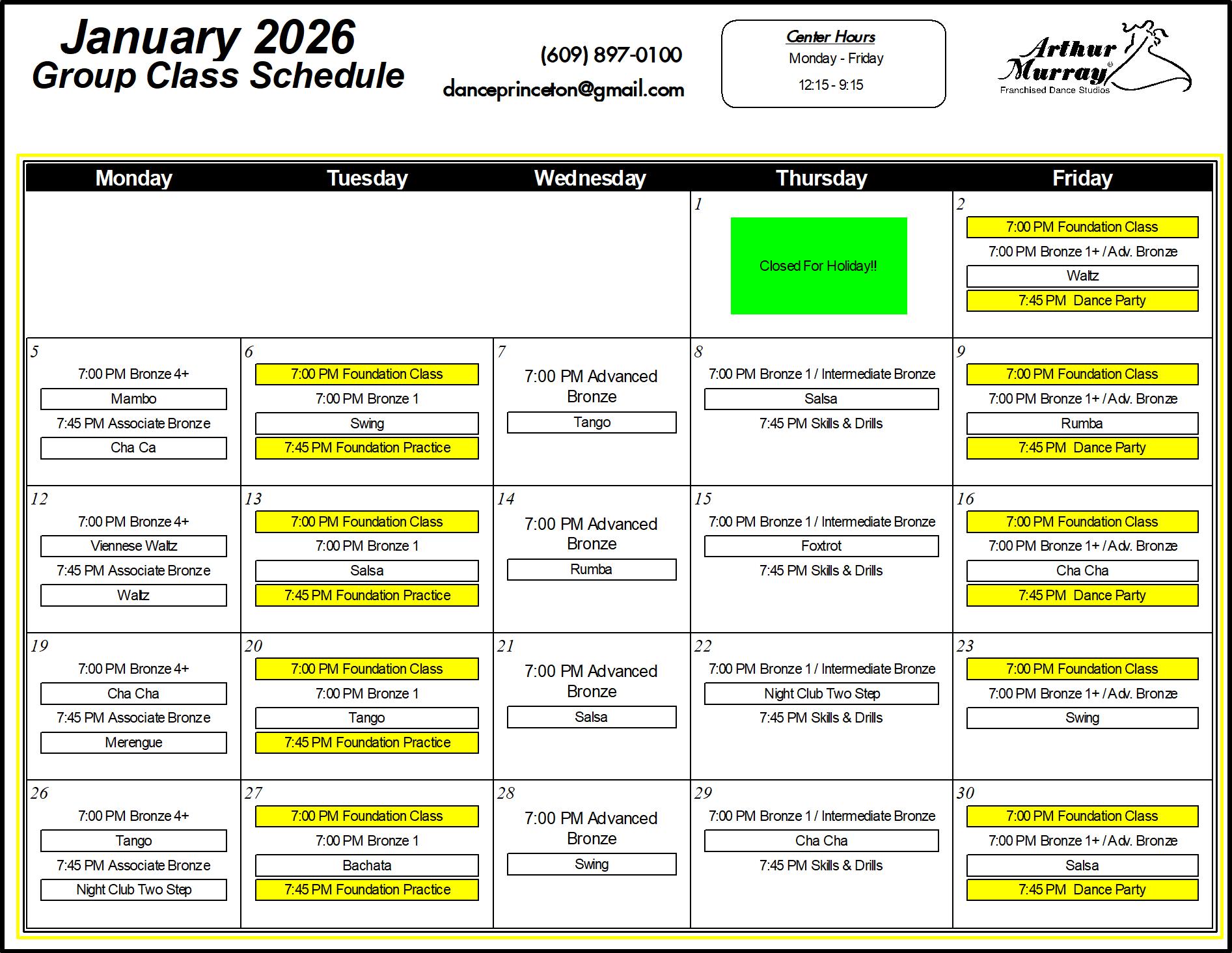 Explore the Arthur Murray Dance Studio class schedule in Princeton, NJ. If you’re interested in joining us, give us a call for more information on how you can get started with our Introductory Lesson!